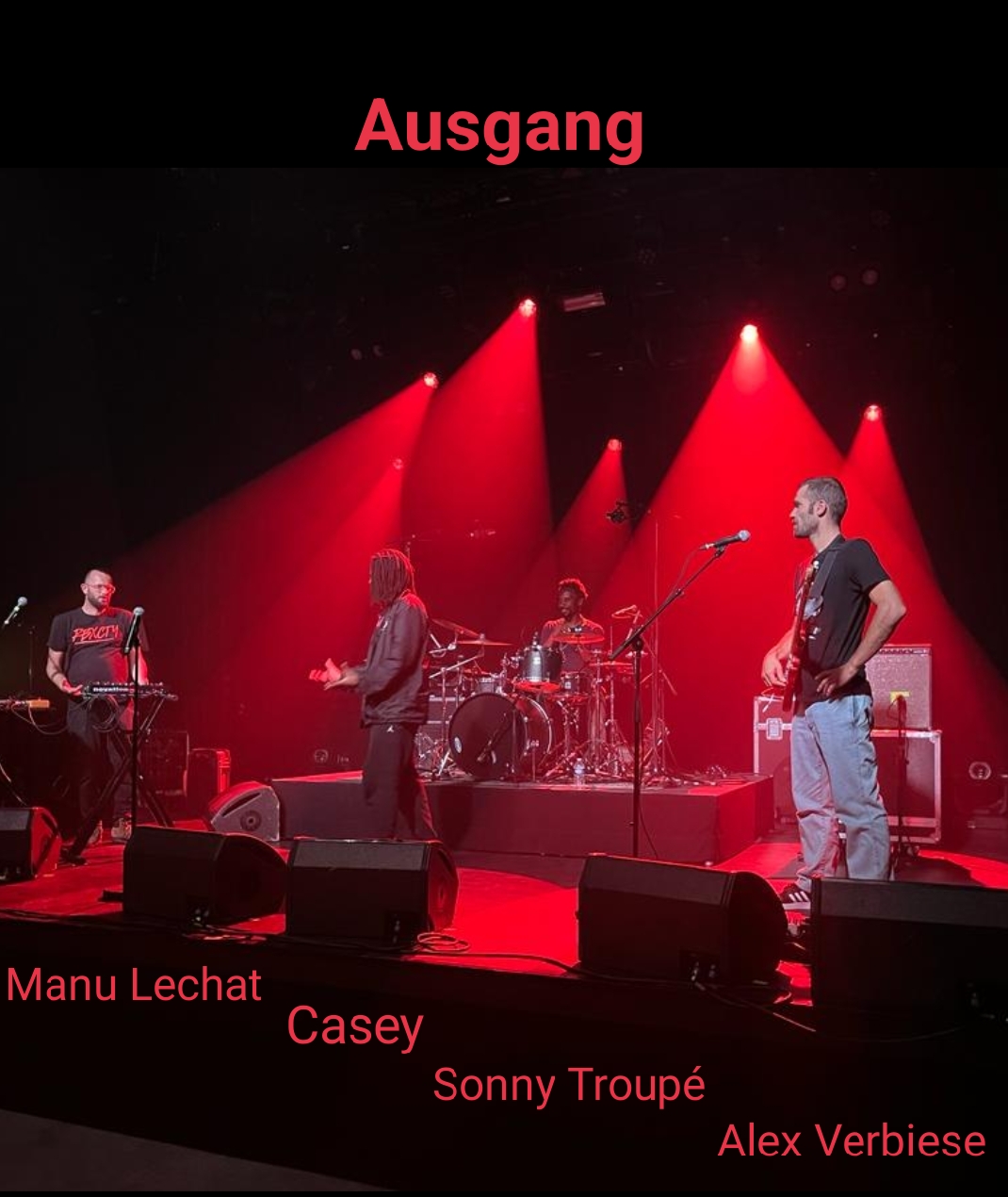 AusgangPar Sonny Troupé / 26 août 2023 Date & heure Le samedi 26 août 2023 à 20:00 Lieu Festival Un Autre Monde Parc Pasteur d'Orléans Orleans - 45000 France Détails Casey : voix Alex Verbiese : guitare Manu Lechat : machines Sonny Troupé : batterie