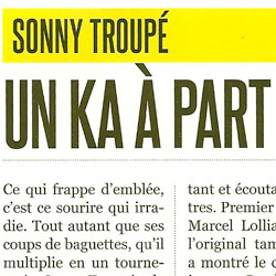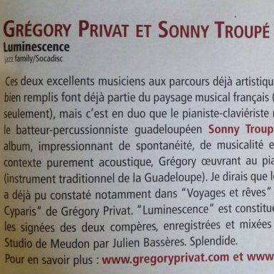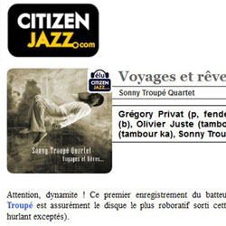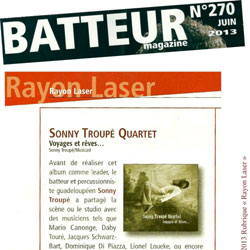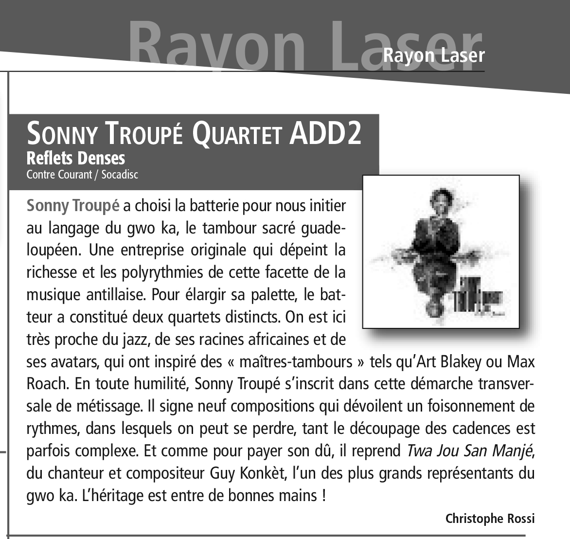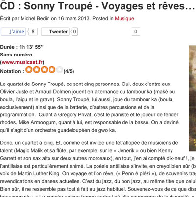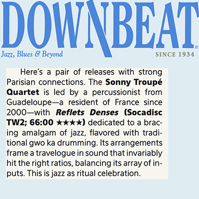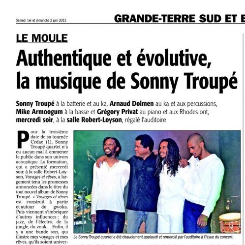 Revues de Presse This is a jazz ritual celebration À propos de Reflets Denses (DownBeat - juillet 2018) Amazing fusion between jazz and gwo ka À propos de Reflets Denses (Jazz Journal - avril 2018) Sonny Troupé Quartet Add2 / Reflets Denses À propos de Reflets Denses (Batteur Magazine - mai 2017) Sonny Troupé, effet miroir sur le gwo ka À propos de Reflets Denses (Open Jazz - 12 avril 2017) Sonny Troupé, incarnation du Tout-Monde À propos de Reflets Denses (l'Humanité - 10 avril 2017) Grégory Privat et Sonny Troupé À propos de Luminescence (Batteur Magazine - juillet 2015) Frères Sourires À propos de Luminescence (Jazz Magazine - février 2015) Un artiste et un album à découvrir À propos de Voyages et Rêves (Batteur Magazine - juin 2013) Authentique et évolutive, la musique de Sonny Troupé À propos de Voyages et Rêves (France Antilles - mai 2013) 2013 Année Troupé À propos de Voyages et Rêves (Siwotaj - mai 2013) Sonny Troupé quartet – Voyages et Rêves À propos de Voyages et Rêves (Jazz Magazine - avril 2013) Attention, dynamite ! À propos de Voyages et Rêves (Citizen Jazz - avril 2013) Sonny Troupé – Voyages et Rêves À propos de Voyages et Rêves (On Topaudio - mars 2013) Un Ka à part À propos de Voyages et Rêves (Jazz News - octobre 2012)